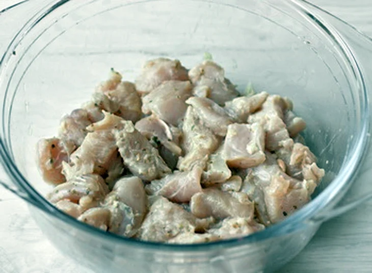 - Куриное мясо нарежьте на небольшие кусочки, посолите и поперчите.
