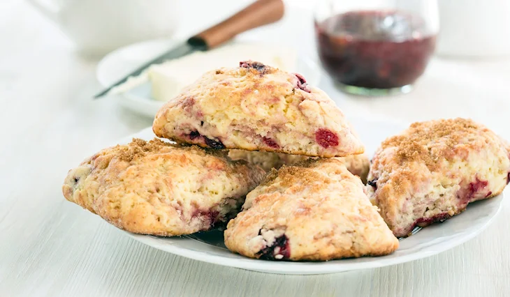 Для более насыщенного вкуса добавьте в тесто щепотку молотой гвоздики или мускатного ореха. Изюм можно заменить другими сухофруктами по вкусу, например, курагой или черносливом. Подавайте сконы горячими со сгущённым молоком, вареньем или медом.