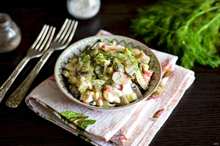 - Готовим крабовые палочки: Обжарить крабовые палочки на сухой сковороде до золотистого цвета (2-3 минуты).